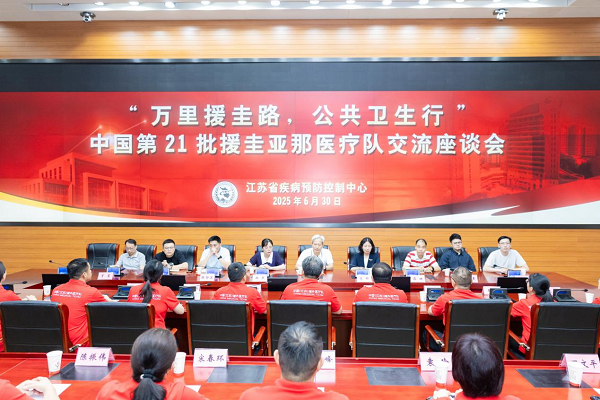 2025年6月30日下午,江苏省卫生健康委国际合作处处长李郁、副处长邢燕率第21批中国(江苏)援圭亚那医疗队全体队员一行20人,赴省疾控中心座谈交流公共卫生援外工作。江苏省疾控中心党委书记朱宝立出席会议。中心相关部门负责人参加会议。
