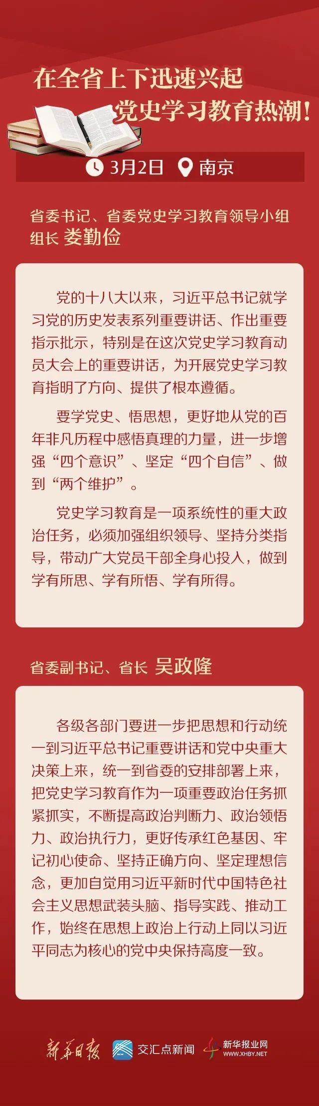 各级各部门要进一步把思想和行动统一到习近平总书记重要讲话和党中央重大决策上来,统一到省委的安排部署上来,把党史学习教育作为一项重要政治任务抓紧抓实,不断提高政治判断力、政治领悟力、政治执行力,更好传承红色基因、牢记初心使命、坚持正确方向、坚定理想信念,更加自觉用习近平新时代中国特色社会主义思想武装头脑、指导实践、推动工作,始终在思想上政治上行动上同以习近平同志为核心的党中央保持高度一致。要高质量高标准组织开展党史学习教育,围绕目标要求、学习内容、工作安排,细化实化具体化,胸怀“两个大局”,心怀“国之大者”,切实做到学史明理、学史增信、学史崇德、学史力行,学党史、悟思想、办实事、开新局。要以硬责任硬学风硬作风确保党史学习教育取得过硬成效,把开展学习教育与更好统筹发展和安全、解决突出民生问题紧密结合起来,力戒形式主义、官僚主义,切实把学习教育成果转化为准确把握新发展阶段、深入贯彻新发展理念、加快构建新发展格局的强大动力和实际成效,更好担负起“争当表率、争做示范、走在前列”的重大使命,奋力谱写“强富美高”新江苏建设的现代化新篇章,以优异成绩迎接建党100周年。