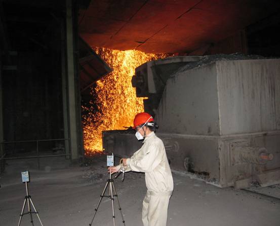 现场检测组在600度钢包前检测高温及其他职业病有害因素