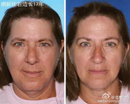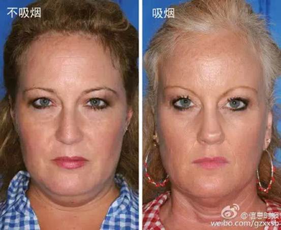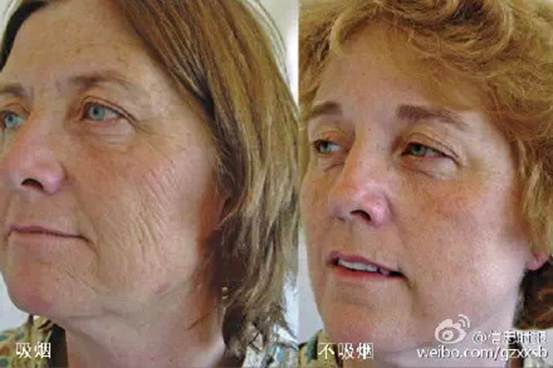 美国科学家找来79对双胞胎,把他们分成两组,一组双胞胎中只有一人吸烟,另一人不吸烟;另一组双胞胎都吸烟,但其中一人烟龄比另一人至少长5年。对比他们的容貌发现,烟民、尤其是老烟民的眼部皮肤更松弛、眼袋下垂、嘴唇周围的皱纹更多。