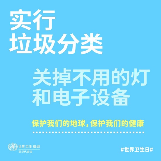 从垃圾分类、多骑车多走路、选本地产的新鲜食物,到拒绝所有烟草制品、关掉不用的灯和电子设备,我们每个人在日常生活中就可以行动起来,保护我们的地球和我们自己的健康。