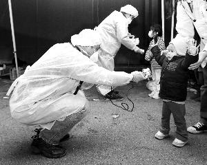 13日,在日本郡山的一个紧急避难所,身着防护服的工作人员检查从福岛第二核电站附近撤离的民众是否遭辐射影响。