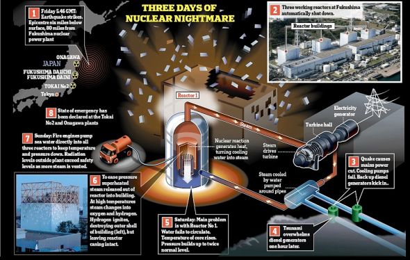 导致日本福岛核电站发生爆炸的具体原因仍是一个未知数,核电站断电可能是因素之一。核电站的地震探测器在探测到地震之后触发了核电站自动关闭的开关,也就是将硼棒插入反应堆芯,阻止产生大量热量的裂变反应。通常情况下,反应堆燃料会在几天时间里冷却到安全状态,但由于海啸破坏了为反应堆冷却泵供电的当地电网和备用发电机,致使冷却泵无法向核电站泵水。