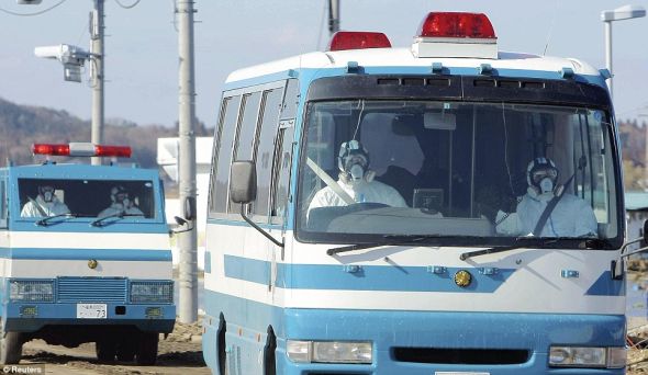 13日,身穿防护服,头戴呼吸器的警察驱车赶往福岛县南相马市核电站。