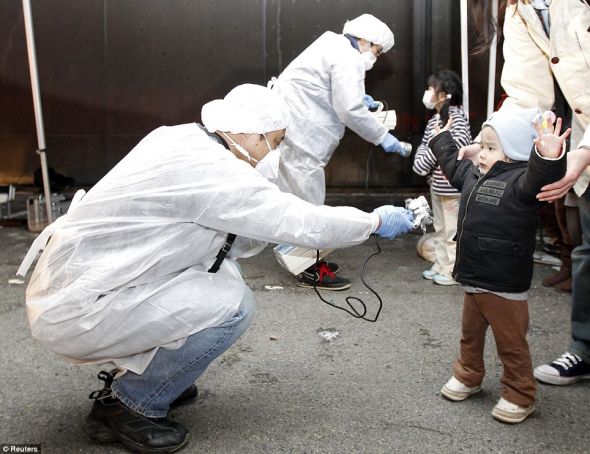 身穿防护服的官员对从核电站附近地区撤离的儿童进行核辐射检查。