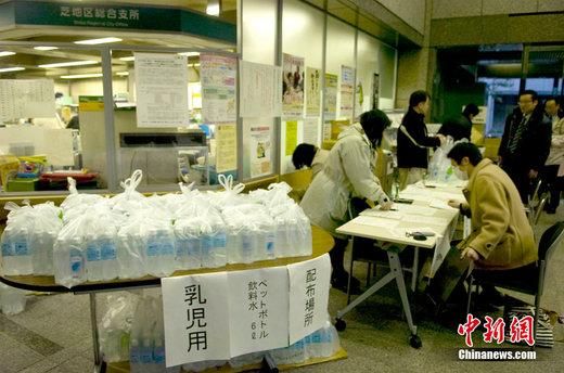 24日,由于东京部分自来水中检测出的放射性碘超过婴儿摄取上限,都政府开始向有婴儿家庭发放共计24万瓶饮用水。图为东京都港区政府向有婴儿家庭发放饮用水。中新社发 孙冉 摄