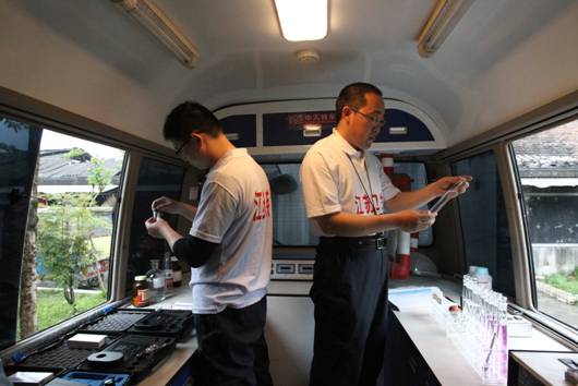 刘华良(右)、谈忠鸣(左)在应急检测车检测平台检测水样