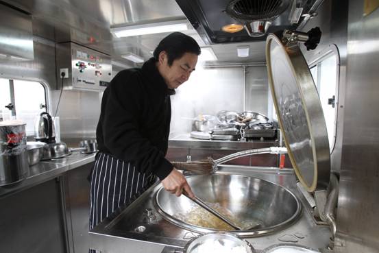 富态的体态,大背头,大嗓门,大厨在后勤保障餐车手掌大勺的形象深入人心。脱去冲锋衣,扎上围腰裙,忙而不乱,威风凛凛,大家风范,与平日熟识的和气形象判若两人,全体队员胃中“风浪”全由这位“食神”化解。
