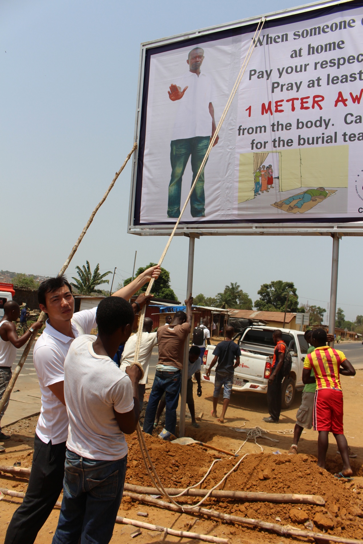 中国援塞公共卫生培训队为让弗里敦各主要交通干道埃博拉防控知识宣传标语走进农村,最大限度覆盖低收入低教育水平农村人群,扫清城市宣传盲区,培训队决定开展ITERP项目的Jui、Kossoh town和Grafton三个村庄全部建立大型埃博拉防控宣传广告牌。中国援塞公共卫生培训队队员、江苏省疾控中心霍翔通过社区走访、人员讨论等大量细致的前期准备,确定在三个村庄人口最密集集市或交通节点安装大型宣传牌,最大程度保证人群“117”埃博拉热线和安全丧葬等宣传信息的覆盖面和可及性。