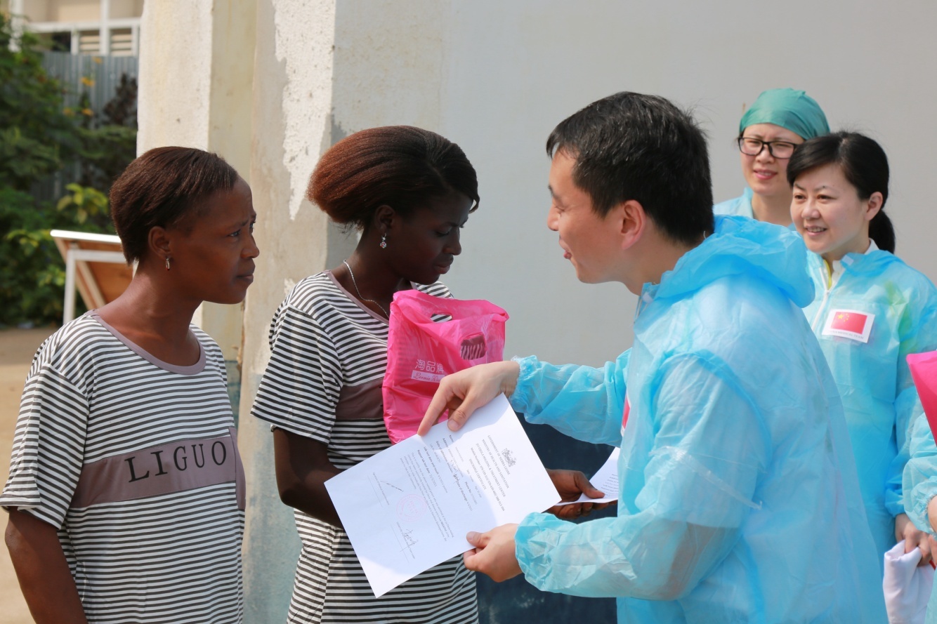 塞拉里昂属于热带地区,气温偏高,隔离病房中没有空调,且经常停水停电。医务人员每次去诊疗病人,都要穿上厚重的防护服,每次做完诊疗,都已是汗流浃背,感觉要虚脱,但是队员们考虑更多的是患者病情,虽然工作强度很大,却没有一个人叫苦叫累。随着治疗过程不断进展,两名患者的症状逐渐有所减轻,但是情绪却依然很低落。要知道埃博拉出血热的病死率高达50%~90%,很多病人在自己确诊之前,已有其他的亲人因该病致死,在病人心目中,埃博拉可能就意味着死亡。针对这种情况,队员们在治疗和护理的同时,也对她们进行了心理治疗,鼓励她们树立战胜病魔的信心。经过中塞双方医务人员20天的共同精心治疗,患者的症状完全消失,4月2日、3日连续两次复查埃博拉病毒核酸阴性,符合治愈出院的标准。首批两例病例的治愈出院,也极大地鼓舞了医疗队的信心,相信不久的将来,中国援塞抗疫医疗队必将与塞国人民一起见证抗击埃博拉战役的胜利。