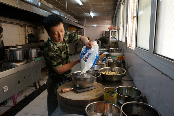 大厨的工作很辛苦。每天5点,天刚蒙蒙亮,两位大厨就开始了一天的劳作。早餐时间是7:30,大厨们要抓紧时间和面蒸馒头、煮鸡蛋、炒制小菜;为了满足46名队员的需求,馒头一般要蒸满满2笼,鸡蛋需要煮一大锅,而这些都必须在2小时内完成。炒菜用的锅是近20斤的大铁锅,加上食材,总重接近40手,王本四师傅本身就有肩周炎,可是为了保障一日三餐,他每天端着沉重的铁锅炒制10次以上。每天晚上回到房间,都必须靠药物和理疗缓解肩部的疼痛,可是他从来没有过因为身体不适而降低伙食品质。塞拉利昂地处热带地区,气温高湿度大,而被炉灶和各种烤箱蒸笼围绕的后厨,温度可想而知。两位大厨每次从后厨出来,都是汗流浃背。即便如此,他们也从来不懈怠一分,甚至坚持在所有人吃完饭之后,才为自己盛一碗饭。赵凤来师傅已经因为忙于后厨的杂事,好几次错过了饭点,不得不泡方面便充饥。大厨的奉献精神让队员们非常感动。