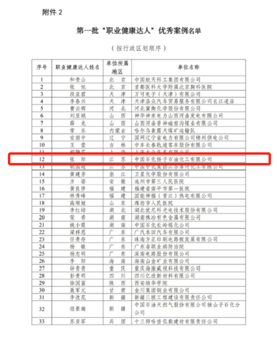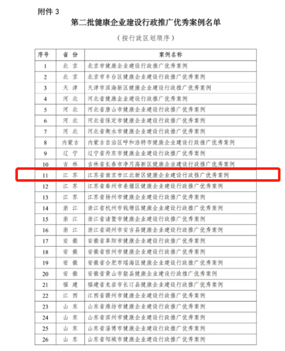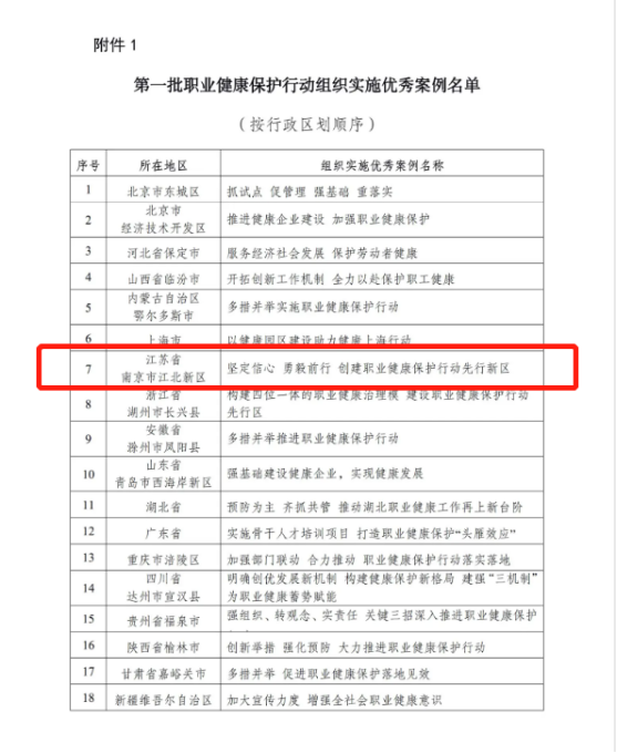 近日,国家卫生健康委办公厅发布了《国家卫生健康委办公厅关于公布一批职业健康保护行动组织实施、“职业健康达人”和健康企业建设等优秀案例的通知》,18个全国职业健康保护行动组织实施优秀案例中,南京江北新区上榜;33个全国第一批“职业健康达人”优秀案例中,南京市中国石化扬子石油化工有限公司职工张阳入选;50个全国健康企业行政推广优秀案例中,南京江北新区再次入选。(具体案例在国家卫生健康委官网可查询)