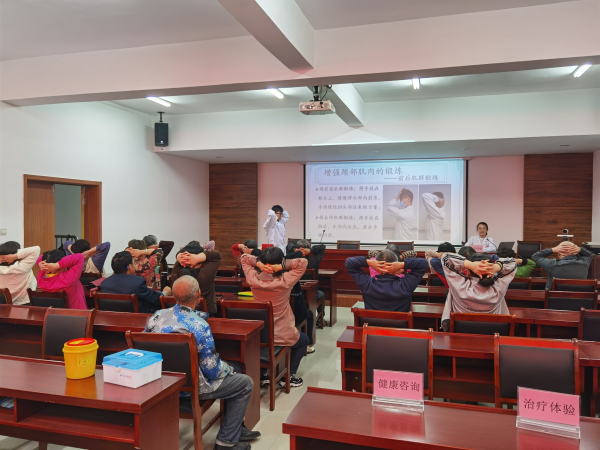 宜兴市丁蜀镇任墅村是紫砂和陶瓷工艺品制作专业村,当地紫砂、陶瓷从业者及长期伏案工作的手艺人众多,由于久坐不动、长期伏案工作、精神高度集中,存在职业紧张、腰部肩部颈部不适等新型职业病危害。在两个村(社区)活动现场,科普工作组开展科普讲座,从颈痛产生原因、相关疾病检查、诊断基本知识几个方面进行了详细的讲解,现场演示医疗运动体操,手把手指导群众学习,并进行运动互动,反馈运动感受。活动现场还发放了健康宣教手册,并解读手册内容,对存在不适症状的群众进行健康咨询,经系统评估后给予健康指导建议及适宜的治疗体验,提供个性化运动处方。