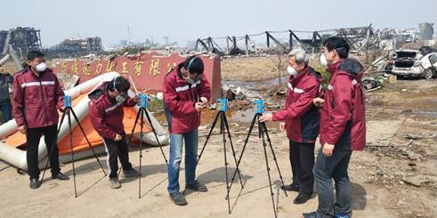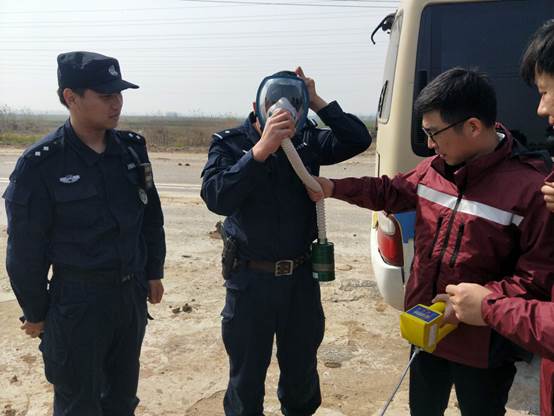 现场检测组专家指导消防抢险现场工作人员正确佩戴个体防护用品